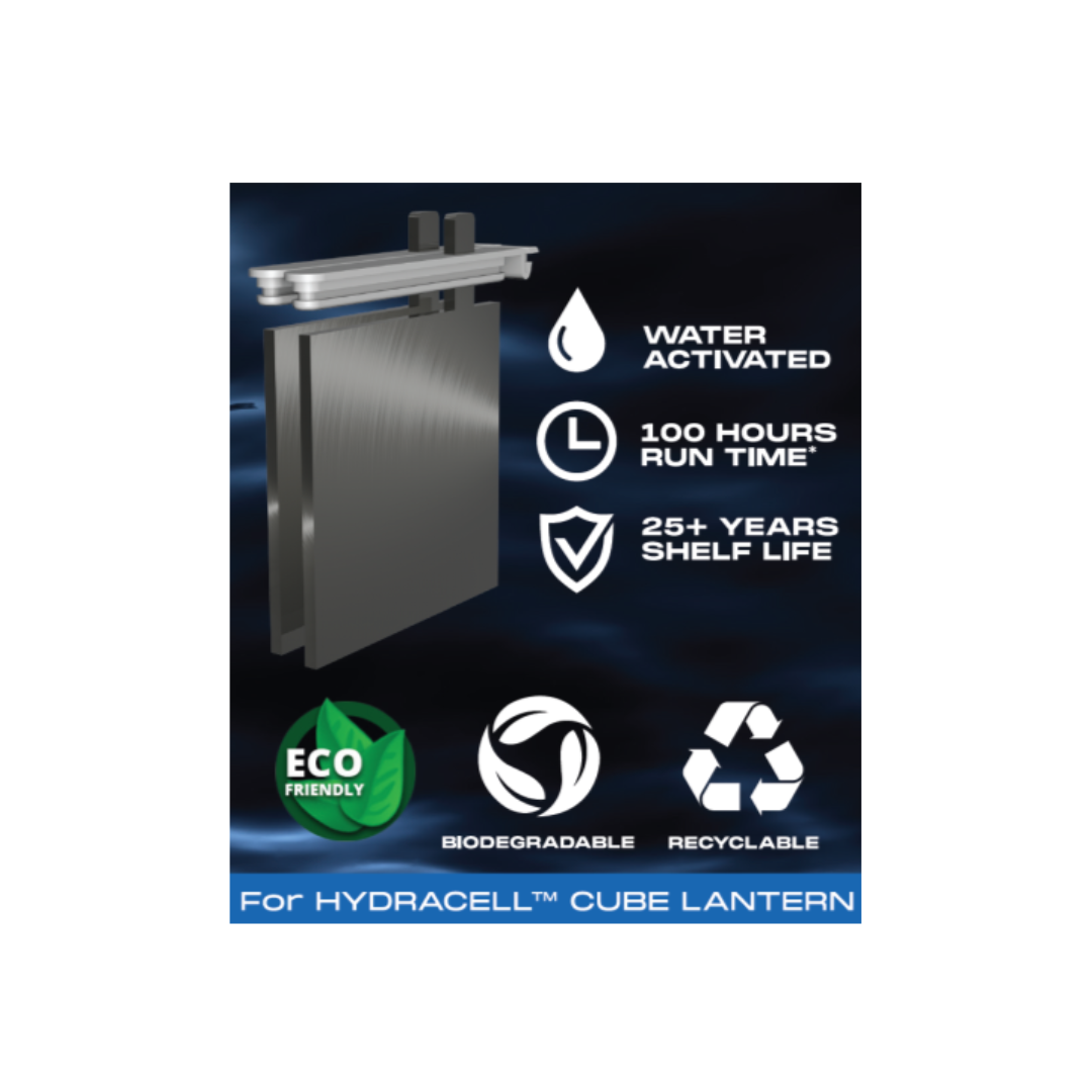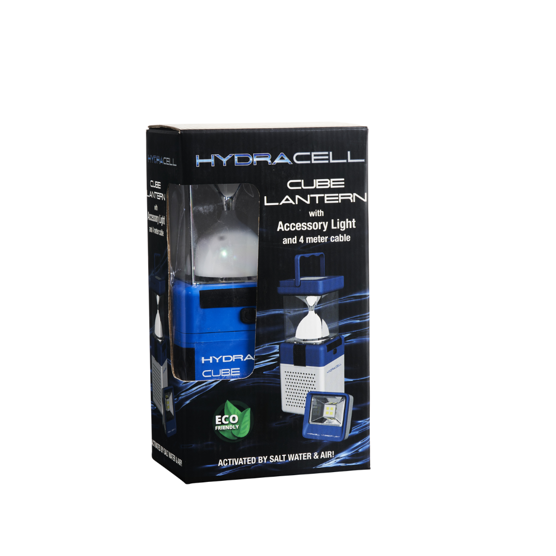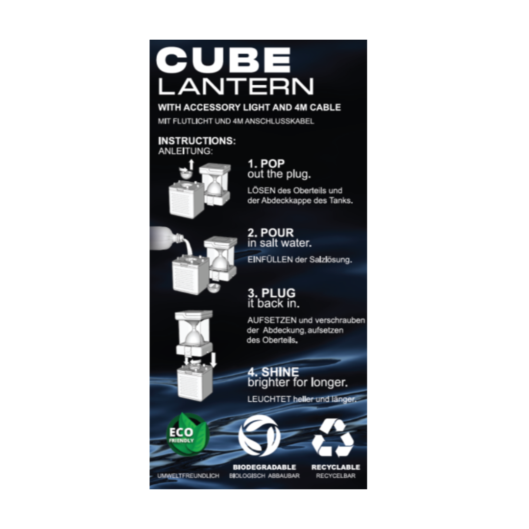 La cella energetica integrata della Cube Lantern genera la propria energia tramite 2 piastre anodiche sostituibili. Viene attivata semplicemente riempiendo il serbatoio integrato con acqua salata.